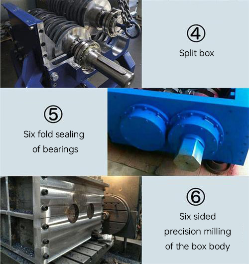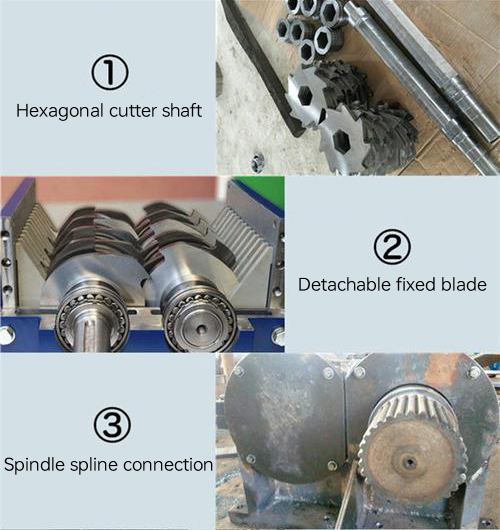 The material enters the interior of the shredding box through the feeding system, and the box is equipped with shredding blades. The material is then subjected to comprehensive actions such as tearing, squeezing, and shearing by the shredding blades, and is shredded into small pieces before being discharged from the lower part of the box.